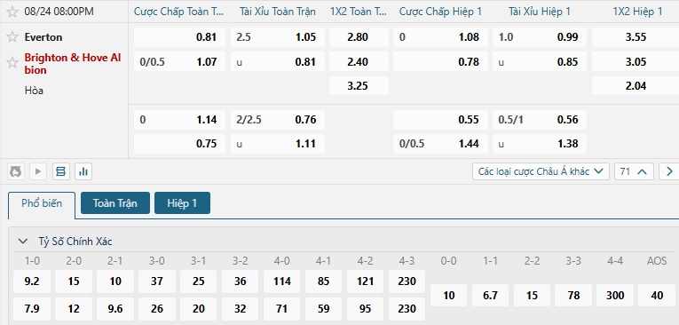 Nhà cái châu Á đang đánh giá cao khả năng chiến thắng của các vị khách Brighton, khi đưa ra mức chấp đang là 0.25, Brighton đang chơi ấn tượng thời gian qua, họ sở hữu phong độ tốt sẻ hướng đến chiến thắng cho mình, trong khi đó Everton lại đang chơi tệ thời gian qua, yếu tố sân nhà cũng không thể giúp Everton được đánh giá cao, lựa chọn Brighton cho kèo Châu Á.