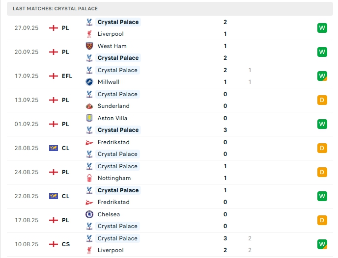 Crystal Palace sau 6 lượt trận đội bóng này có cho mình 8 bàn thắng cùng hàng thủ nhận 3 bàn thua, hàng công chơi tốt và hàng thủ chắc chắn giúp Crystal Palace đang bay cao, khi thi đấu xa nhà ở 3/5 trận vừa qua khép lại không quá 2 bàn, hàng thủ đang là điểm tựa vững chắc của Crystal Palace.