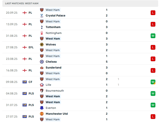 West Ham Utd sau 5 lượt trận đội bóng này có cho mình 5 bàn thắng cùng hàng thủ chơi tệ khi nhận đến 13 bàn thua, cả 5 trận vừa qua của West Ham Utd khép lại vượt mốc trên 3 bàn, khi thi đấu xa nhà West Ham Utd ở 4/5 trận vừa qua cũng vượt mốc 3 bàn, hàng thủ đang chơi tệ khiến West Ham Utd đang gặp nhiều khó khăn.