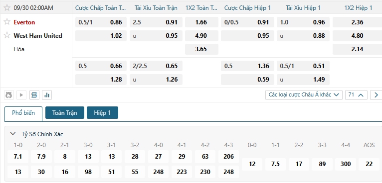 Bảng tỷ lệ kèo bóng đá trận đấu Everton vs West Ham Utd