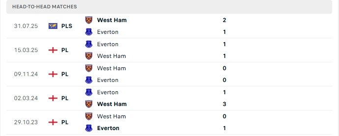 Những màn đụng độ giữa Everton và West Ham Utd thường diễn ra chặt chẻ với ít bàn thắng được tạo ra, cụ thể ở 3/5 lần gặp nhau gần nhất của hai đội và 4/5 lần đón tiếp West Ham Utd trên sân nhà của Everton khép lại không quá 2 bàn, Everton và West Ham Utd sẻ nhập cuộc với sự chặt chẻ khi đó bàn thắng sẻ khó xuất hiện nhiều.