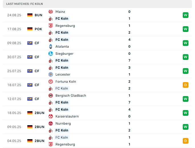 FC Koln ở ngày ra quân họ có khởi đầu tốt khi có được chiến thắng 1-0 trước Mainz, 3 điểm có được đang giúp sự tự tin lên cao, phong độ thời gian qua của FC Koln là cực kỳ tốt, họ bất bại ở 10 trận gần nhất với 8 chiến thắng cùng 2 hòa, trên sân nhà của mình FC Koln cũng bất bại ở 5 trận gần nhất với 4 chiến thắng cùng 1 hòa.
