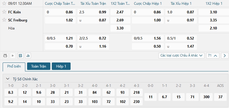 Bảng tỷ lệ kèo bóng đá trận đấu FC Koln vs Freiburg