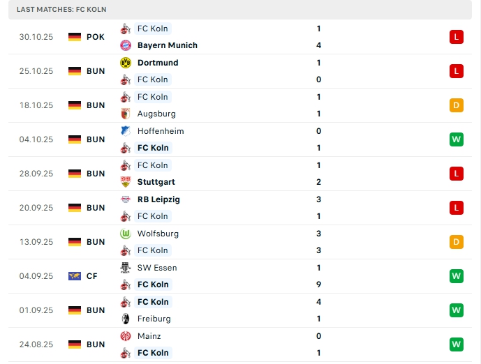FC Koln sau 8 trận đấu, đội bóng này mang về 3 chiến thắng,2 hòa và 3 thất bại, có được 11 điểm và đang xếp thứ 8 trên BXH, ở vòng đấu gần nhất FC Koln nhận thất bại 1-4 trước Bayern Munich, đây là trận không thắng thứ 3 liên tiếp, phong độ thời gian qua của FC Koln là không tốt, đội bóng này chỉ thắng 1 ở 6 trận gần nhất với 4 thất bại cùng 1 hòa, trên sân nhà FC Koln cũng chưa có chiến thắng ở 3 trận vừa qua, trong đó có 1 hòa và 2 thất bại.