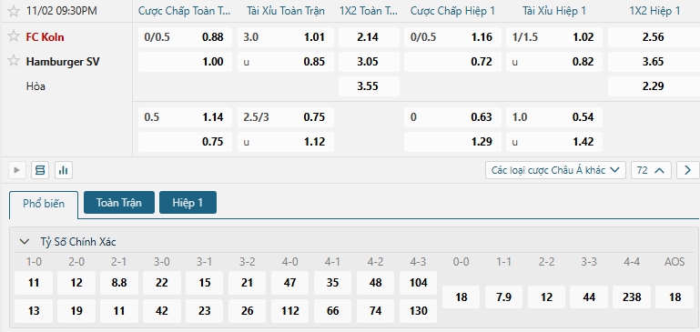 Bảng tỷ lệ kèo bóng đá trận đấu FC Koln vs Hamburger