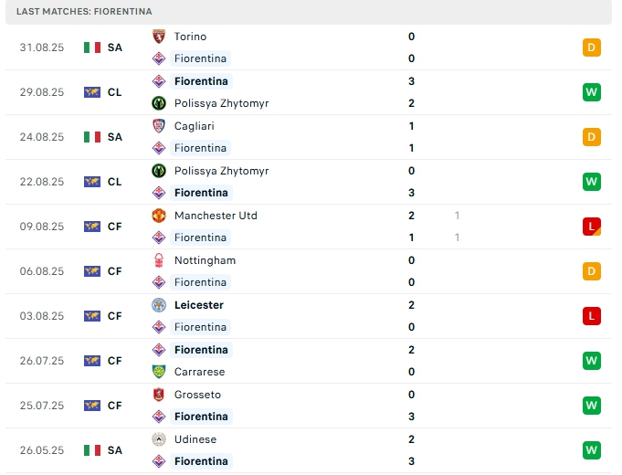 Fiorentina sau 2 trận đấu, đội bóng này mang về 1 bàn thắng cùng hàng thủ nhận 1 bàn thua, cả 2 trận đấu đó khép lại không quá 2 bàn thắng, trên sân nhà của mình ở 4/5 trận vừa qua của Fiorentina khép lại từ 3 bàn thắng trở lên. Hàng công của Fiorentina chơi tốt trên sân nhà nhưng hàng thủ cũng đang là điểm yếu.