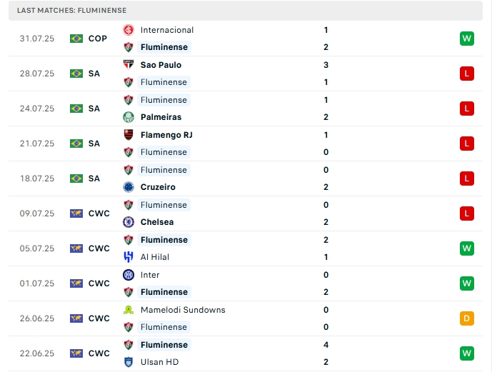 Fluminense sau 15 trận đấu, Fluminense có được 6 chiến thắng, 2 hòa và 7 thất bại, mang về 20 điểm và đang xếp vị trí thứ 12 trên BXH, phong độ thời gian qua của Fluminense sau khi trở về từ đấu trường Club World Cup là không tốt, đội bóng này trải qua chuỗi 4 thất bại liên tiếp ở sân chơi quốc nội, trên sân nhà của mình Fluminense cũng để thua 2 trận liên tiếp vừa qua.