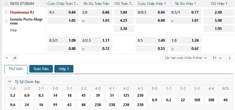 Bảng tỷ lệ kèo bóng đá trận đấu Fluminense vs Gremio