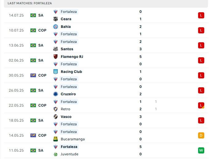 Fortaleza sau 13 trận đấu, có được 2 chiến thắng, 4 hòa và 7 thất bại, mang về 10 điểm và đang xếp vị trí thứ 19 trên BXH, phong độ thời gian qua của Fortaleza là cực kỳ tệ, trận thua trước Ceara ở vòng đấu gần nhất là thất bại thứ 8 liên tiếp của họ, trên sân nhà Fortaleza cũng chơi cực tệ khi thua 4 trên 5 trận vừa qua.