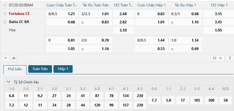 Nhà cái Châu Á đang đánh giá khả năng chiến thắng của Fortaleza là cao hơn khi đưa ra mức chấp là 0.25, đây là điều khá bất ngờ, dù có được ưu thế sân nhà nhưng với phong độ tệ hại khó lòng đặt niềm tin vào Fortaleza trong trận đấu này, Fortaleza đã sa sút khá nhiều, trong khi Bahia cho thấy sự phát triển của mình, lựa chọn Bahia ở kèo châu Á.