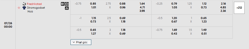 Nhà cái châu Âu đang đánh giá khả năng chiến thắng của Fredrikstad là cao hơn so với các vị khách Stromsgodset, tỷ lệ giành chiến thắng của Fredrikstad đang là 1.64 và các cầu thủ khách Stromsgodset là 4.71, chênh lệch là đủ lớn để đặt niềm tin vào Fredrikstad khi mà Stromsgodset đang chơi cực tệ, lựa chọn Fredrikstad cho kèo Châu Âu.