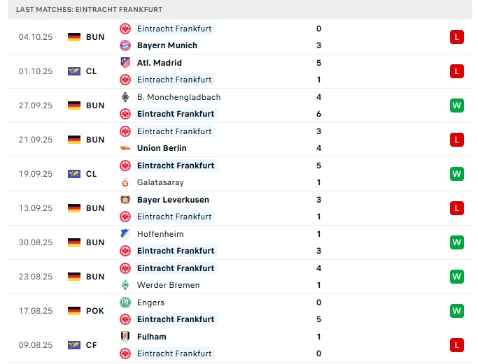 Frankfurt sau 6 trận đấu , hàng công chơi tốt khi mang về 17 bàn thắng, dù vậy hàng thủ thiếu chắc chắn khi nhận đến 16 bàn thua, cả 5 trận vừa qua của Frankfurt khép lại từ 3 bàn trở lên, khi thi đấu xa nhà ở 5 trận gần nhất thì cả 5 trận đều khép lại trên 4 bàn thắng.