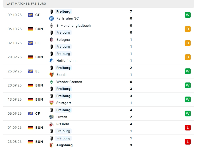 Freiburg sau 6 vòng đấu, đội bóng này mang về 2 chiến thắng, 2 hòa cùng 2 thất bại, có được 8 điểm và đang xếp vị trí thứ 8 trên BXH, ở vòng đấu gần nhất Freiburg có trận hòa trước B. Monchengladbach, phong độ thời gian qua của Freiburg là ấn tượng với chuỗi 8 trận bất bại liên tiếp, trong đó có 5 chiến thắng cùng 3 hòa, trên sân nhà của mình Freiburg cũng thắng 4, hòa 1 ở 5 trận vừa qua.
