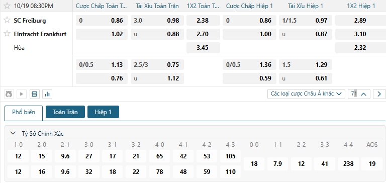 Nhà cái châu Á đang đánh giá cao khả năng chiến thắng của hai đội là khá cân bằng, khi đưa ra mức chấp đang là đồng banh, với sự chuẩn bị kỹ lưỡng, ưu thế sân nhà cùng quyết tâm đang có Freiburg hứa hẹn mang đến nhiều khó khăn cho Frankfurt, dù vậy Frankfurt cũng có được phong độ khá tốt khi xa nhà, hơn nữa lịch sử đụng độ giữa hai đội là khá cân bằng, khả năng cao 90 phút sắp tới sẻ bất phân thắng bại.
