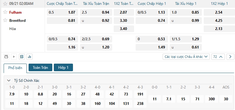 Bảng tỷ lệ kèo bóng đá trận đấu Fulham vs Brentford
