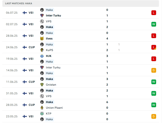 Bên kia sân,Haka ở vòng đấu gần nhất họ để thua 0-1 trước Inter Turku, đây là trận thua thứ 4 của đội bóng này ở 5 trận gần nhất, sau 14 trận đấu, Haka mang về 4 chiến thắng, 3 hòa cùng 7 thất bại có được 15 điểm và đang xếp vị trí thứ 10 trên BXH, phong độ thời gian qua của Haka là không tốt khi chỉ có 1 chiến thắng ở 5 trận gần nhất và cũng đang chơi tệ khi xa nhà.