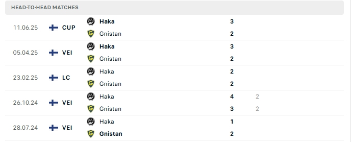Những màn đụng độ giữa Gnistan và Haka thường diễn ra hấp dẫn với nhiều bàn thắng được tạo ra, cụ thể ở cả 5 lần gặp nhau gần nhất của hai đội và lần đón tiếp Haka gần nhất trên sân của Gnistan cũng khép lại với 3 bàn thắng.