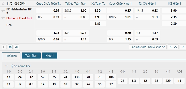 Bảng tỷ lệ kèo bóng đá trận đấu Heidenheim vs Frankfurt