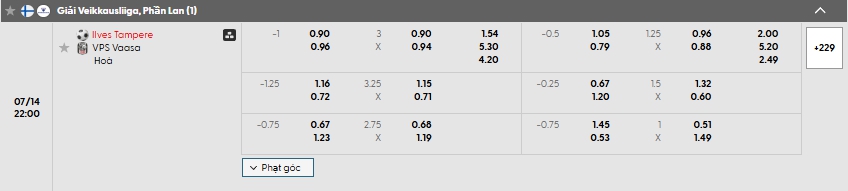 Bảng tỷ lệ kèo bóng đá trận đấu Ilves Tampere vs VPS Vaasa