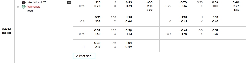 Nhà cái Châu Á đang đánh giá cao Palmeiras qua mức kèo chấp đang là 0.25, tuy vậy khó để Palmeiras có thể đánh bại được đội chủ nhà lúc này, Inter Miami đang có nhiều cầu thủ có kinh nghiệm trong đội hình nên đội bóng này sẽ chơi tốt trước đối thủ, Inter Miami sẽ thi đấu với tinh thần quyết tâm cao nên họ sẽ có được 1 kết quả hoà ở trận đấu này.