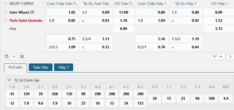 Nhà cái châu Âu đang đánh giá khả năng có được chiến thắng của PSG là cao hơn so với đối thủ, tỷ lệ thắng kèo của PSG là 1.18 và Inter Miami là 11.00, chênh lệch là đủ để đặt niềm tin vào các cầu thủ PSG trong trận đấu này khi họ sở hữu sức mạnh vượt trội.