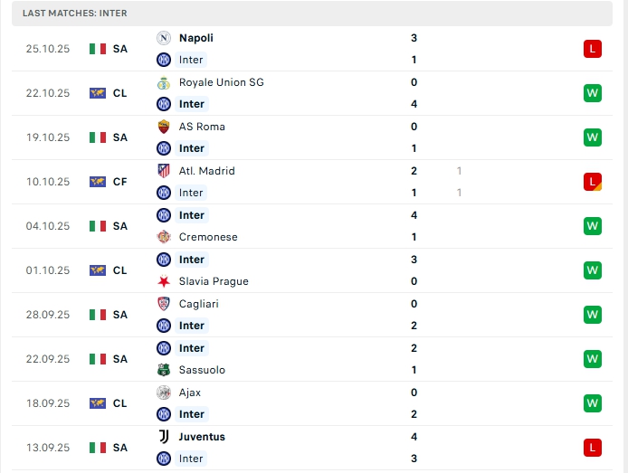 - Phong độ Inter Milan