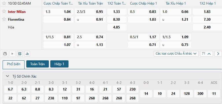 Nhà cái châu Á đang đánh giá cao khả năng chiến thắng của chủ nhà Inter Milan, khi đưa ra mức chấp đang là 1.5, Inter Milan với ưu thế sân nhà, thực lực vượt trội hứa hẹn sẻ kiểm soát thế trận và chơi tấn công trước đối thủ, Inter Milan đang đặt nhiều quyết tâm ở mùa giải năm nay, họ hứa hẹn sẻ có kết quả tốt trong trận đấu này, trong khi Fiorentina lại đang chơi tệ khó lòng cản nổi chủ nhà, lựa chọn Inter Milan cho kèo châu Á.