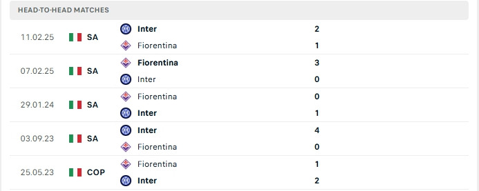 Lịch sử đối đầu của Inter Milan vs Fiorentina