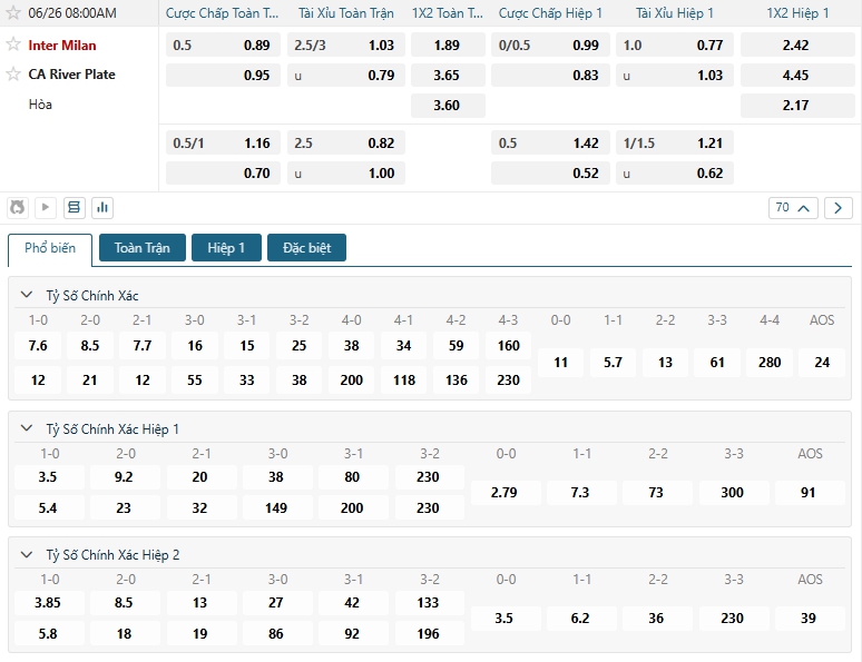 Bảng tỷ lệ kèo bóng đá trận đấu Inter Milan vs River Plate