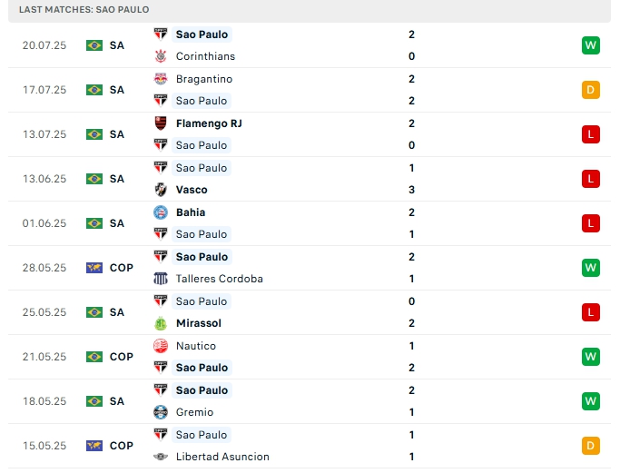 Sao Paulo sau 15 trận đấu hàng công của đội bóng này mang về 14 bàn thắng cùng hàng thủ nhận 18 bàn thua, 3/5 trận vừa qua của họ khép lại từ 3 bàn thắng trở lên, khi thi đấu xa nhà ở 3/5 trận gần nhất của họ khép lại không quá 2 bàn, Sao Paulo thường thi đấu khá thực dụng mỗi khi phải hành quân xa nhà.