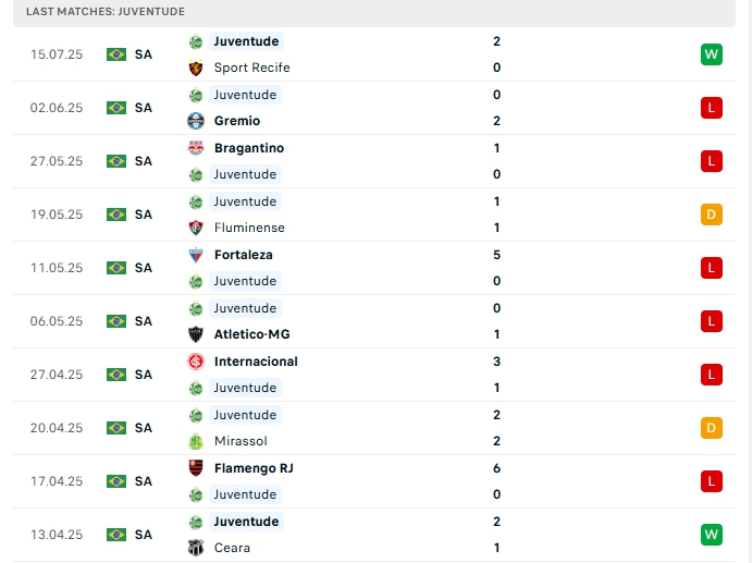 Juventude sau 12 lượt trận họ mang về 3 chiến thắng, 2 hòa và nhận 7 thất bại, có được 11 điểm và đang xếp vị trí thứ 18 trên BXH, phong độ thời gian qua của Juventude là cực kỳ tệ, dù vừa có được chiến thắng nhưng trước đó họ trải qua chuỗi 8 trận liên tiếp không biết đến mùi chiến thắng khi thua 6 và hòa 2 ở 8 trận gần nhất, trên sân nhà của mình Juventude cũng chỉ có được 1 chiến thắng 2 hòa cùng 2 thất bại ở 5 trận gần nhất.