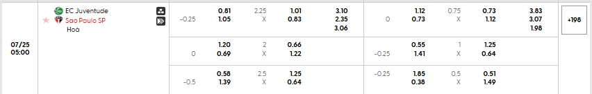 Bảng tỷ lệ kèo bóng đá trận đấu Juvetude vs Sao Paulo