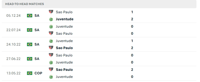 Lịch sử đối đầu của Juvetude vs Sao Paulo