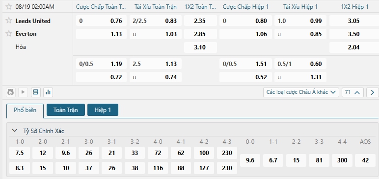 Nhà cái châu Á đang đánh giá cao khả năng chiến thắng của hai đội là khá cân bằng, khi đưa ra mức tỷ lệ đang là đồng banh, Leeds dù là tân binh ở mùa giải năm nay nhưng họ có ưu thế sân nhà và đang chơi tốt thời gian qua, ngược lại Everton đang thể hiện bộ mặt bạc nhược khi chưa có chiến thắng nào ở loạt giao hữu gần nhất, lựa chọn Leeds cho kèo Châu Á.