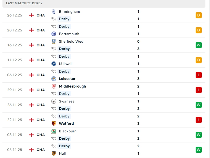 Derby County sau 23 lượt trận, hàng công của đội bóng này mang về 32 bàn thắng cùng hàng thủ nhận 31 bàn thua, hàng thủ cũng đang là điểm yếu của Derby County, 4/5 trận xa nhà của Derby County khép lại trên 3 bàn.