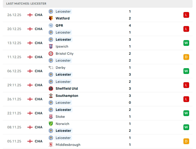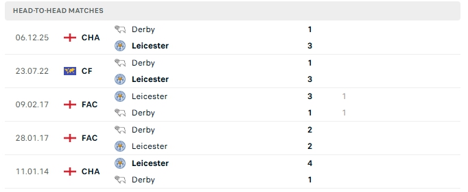 Những màn đụng độ giữa Leicester City và Derby County thường diễn ra hấp dẫn với nhiều bàn thắng được tạo ra, cụ thể ở 5 lần gặp nhau gần nhất của hai đội và cả 5 lần đón tiếp Derby County trên sân của Leicester City khép lại trên 3 bàn.