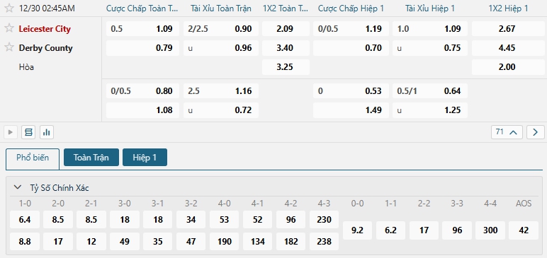 Bảng tỷ lệ kèo bóng đá trận đấu Leicester City vs Derby County