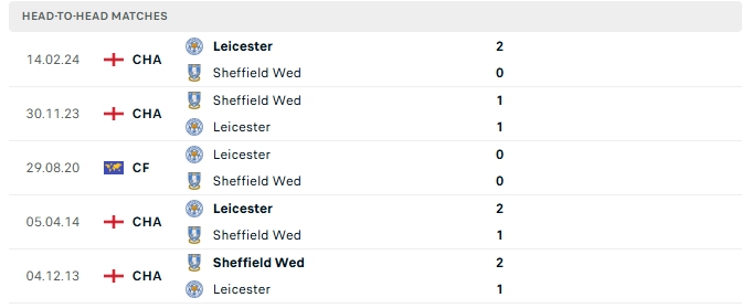 Lịch sử đối đầu của Leicester City vs Sheffield Wed