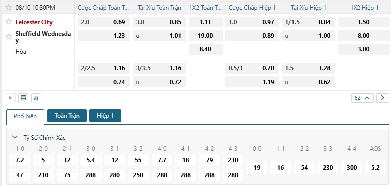 Bảng tỷ lệ kèo bóng đá trận đấu Leicester City vs Sheffield Wed