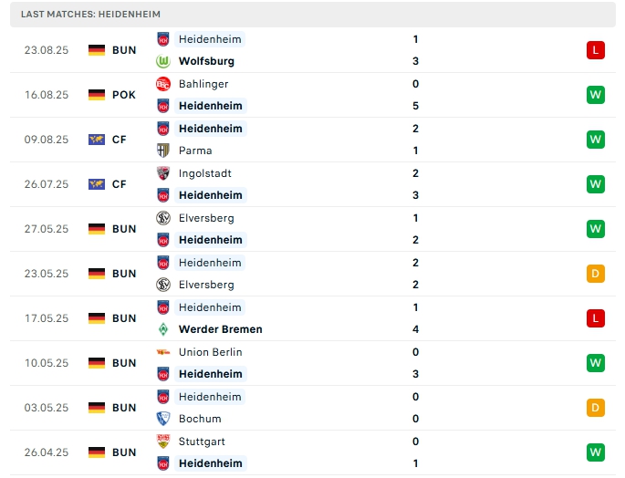 Heidenheim ở trận ra quân họ nhận thất bại 1-3 trước Wolfsburg, hàng thủ cũng đang là điểm yếu của Heidenheim, cả 5 trận gần nhất của Heidenheim đều khép lại từ 3 bàn thắng trở lên và 4/5 trận xa nhà của họ cũng vượt mốc trên 3 bàn.