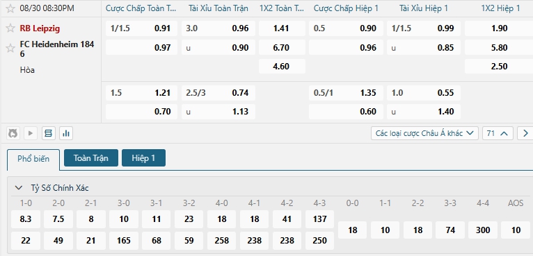Bảng tỷ lệ kèo bóng đá trận đấu Leipzig vs Heidenheim