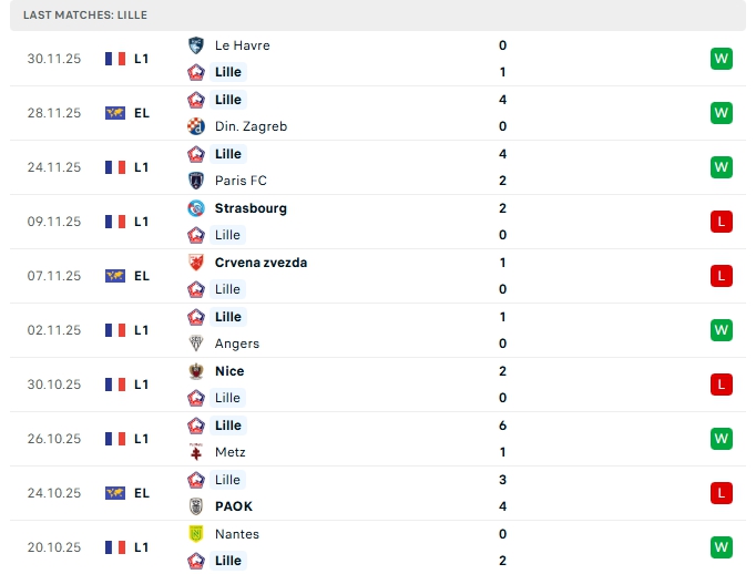Lille  sau 14 trận đấu họ có được 8 chiến thắng, 2 hòa và 4 thất bại, mang về 26 điểm và đang xếp ở vị trí thứ 4 trên BXH, ở vòng đấu gần nhất Lille có chiến thắng 1-0 trước Le Havre, đây là chiến thắng thứ 3 liên tiếp, trước đó Lille nhận thất bại 0-2 trước Crvena zvezda ở đấu trường Europa League, trên sân nhà Lille sau 3 trận đấu không tốt thì vừa qua họ có 2 chiến thắng liên tiếp.