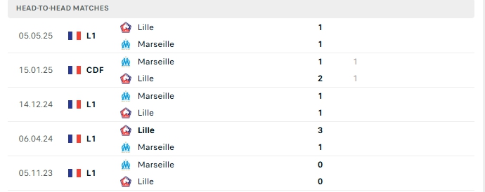 Những màn đụng độ giữa Lille và Marseille thường diễn ra chặt chẻ với ít bàn thắng được tạo ra, cụ thể ở 4/5 lần gặp nhau gần nhất của hai đội và 3/5 lần đón tiếp Marseille trên sân của Lille khép lại không quá 2 bàn thắng.