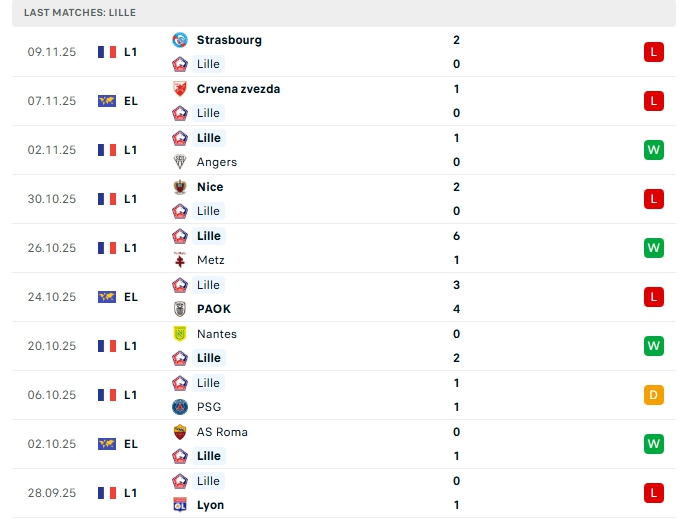 Lille  sau 12 trận đấu họ có được 6 chiến thắng, 2 hòa và 4 thất bại, mang về 20 điểm và đang xếp ở vị trí thứ 5 trên BXH, ở vòng đấu gần nhất Lille nhận thất bại 0-2 trước Strasbourg, đây là trận thua thứ 2 liên tiếp, trước đó Lille nhận thất bại 0-2 trước Crvena zvezda ở đấu trường Europa League, trên sân nhà Lille sau 3 trận đấu không tốt thì vừa qua họ có 2 chiến thắng liên tiếp.