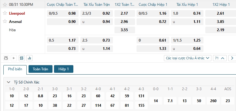 Nhà cái châu Á đang đánh giá cao khả năng chiến thắng của chủ nhà Liverpool là cao hơn nhiều, khi đưa ra mức chấp đang là 0.25, Liverpool sở hữu lối chơi ấn tượng, thực lực được đánh giá nhỉnh hơn, dù Arsenal sẻ gây nhiều khó khăn cho các cầu thủ nhà khi họ cũng đang chơi tốt và cực kỳ ấn tượng, nhưng Liverpool vẫn hứa hẹn là đội có được chiến thắng với ưu thế sân bãi đang có, lựa chọn Liverpool cho kèo châu Á.