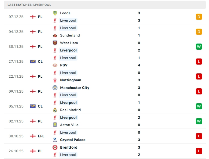 Liverpool sau 15 trận đấu họ mang về 7 chiến thắng, 2 hòa cùng 6 thất bại, có được 23 điểm và đang xếp vị trí thứ 10 trên BXH, ở vòng đấu gần nhất The Kop chỉ có trận hòa trước Leeds, đây là trận thứ 2 không thắng của đội bóng này, phong độ thời gian qua của Liverpool là không tốt, trên sân nhà họ trải qua chuỗi 3 trận không thắng khi thua 2 và hòa 1 ở 3 trận vừa qua.