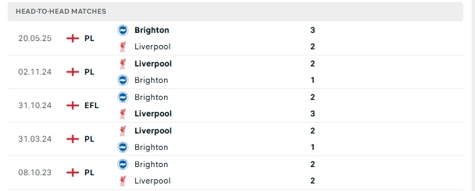 Những màn đụng độ giữa Liverpool và Brighton thường diễn ra hấp dẫn với nhiều bàn thắng được tạo ra, cụ thể ở cả 5 lần gặp nhau gần nhất của hai đội và 4/5 lần đón tiếp Brighton trên sân của Liverpool khép lại trên 3 bàn.
