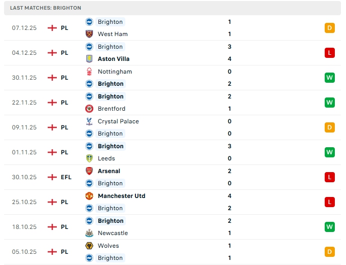 Brighton sau 15 lượt trận đội bóng này có cho mình 25 bàn thắng cùng hàng thủ nhận 21 bàn thua, hàng công vẫn là điểm nhấn, bên cạnh hàng thủ không quá chắn chắn, khi thi đấu xa nhà ở 5 trận gần nhất thì có 3 trận họ nhận từ 2 bàn thua.