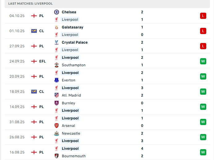 Liverpool ở 7 vòng đấu đầu tiên, họ mang về 5 chiến thắng cùng 2 thất bại, họ có được 15 điểm và đang xếp vị trí 2 trên BXH, ở trận gần nhất Liverpool nhận thất bại 1-2 trước Chelsea, đây là thất bại thứ 3 liên tiếp của The Kop, đoàn quân của HLV Arne Slot đang bị đặt nhiều hoài nghi, dù vậy trên sân nhà họ vẫn đang chơi cực tốt với chuỗi 7 chiến thắng liên tiếp.