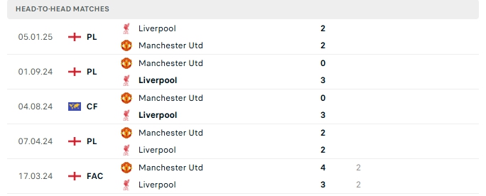 Những màn đụng độ giữa Liverpool và Man Utd thường diễn ra hấp dẫn với nhiều bàn thắng được tạo ra, cụ thể ở cả 5 lần gặp nhau gần nhất của hai đội và 3/5 lần đón tiếp Man Utd trên sân của Liverpool khép lại trên 3 bàn.